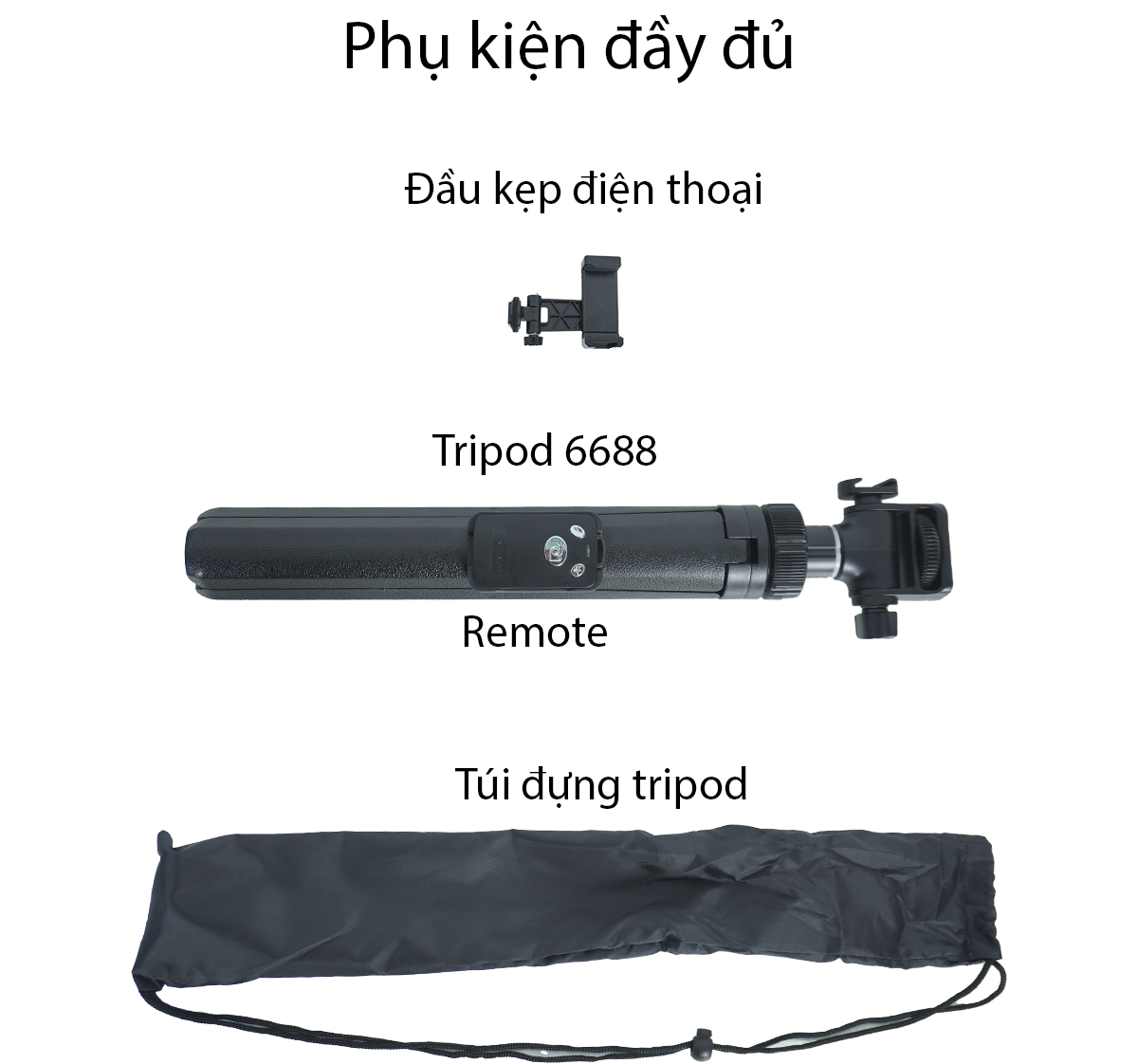 • Phụ kiện kèm theo gồm: Remote Yunteng - Kẹp điện thoại - Túi đựng du lịch